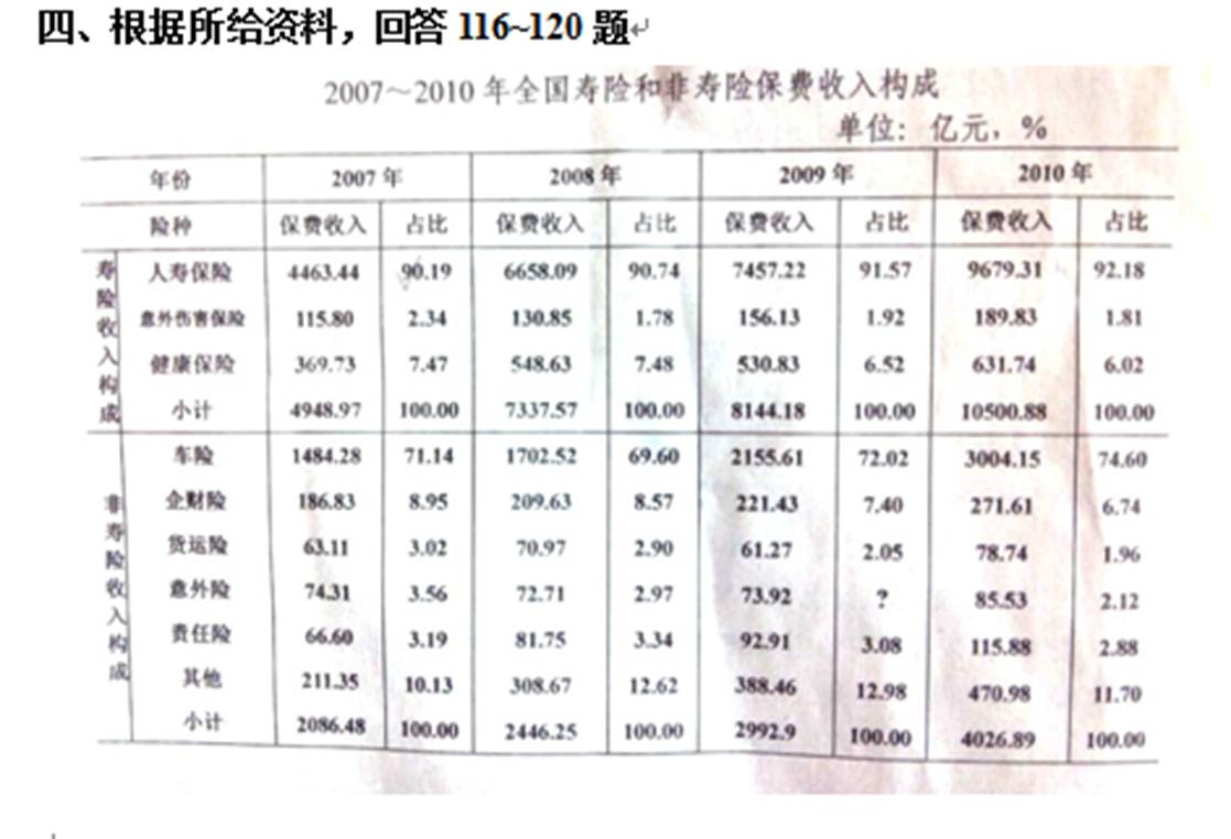 119.2008年-2010年,非寿险中车险收入的平均增长率为: