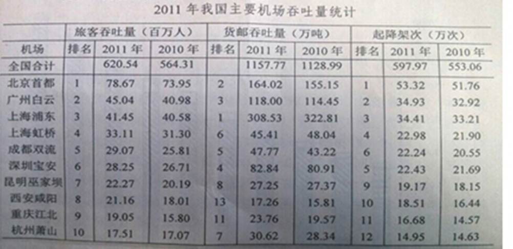 105.以下关于2011年我国机场吞吐量说法正确的是: