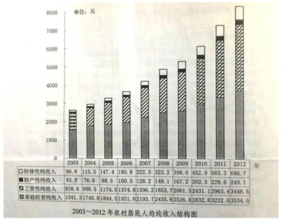 110.以下关于2007~2012年间农村居民人均纯收入结构的描述正确的是: