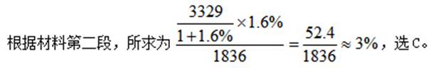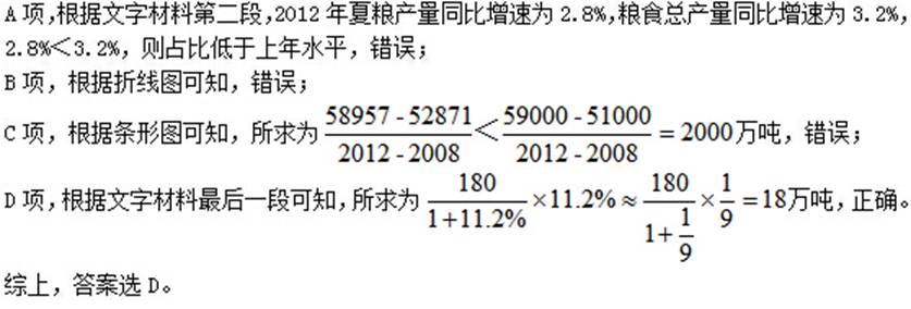 【解析】D。根据图形可知,2012年粮食产量为58957万吨,同比增长3.2%,则所求为58957×(1+3.2%)≈59000+60000×3%=60800万吨=6.08亿吨,最接近的是D项。