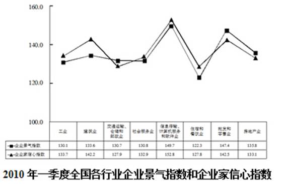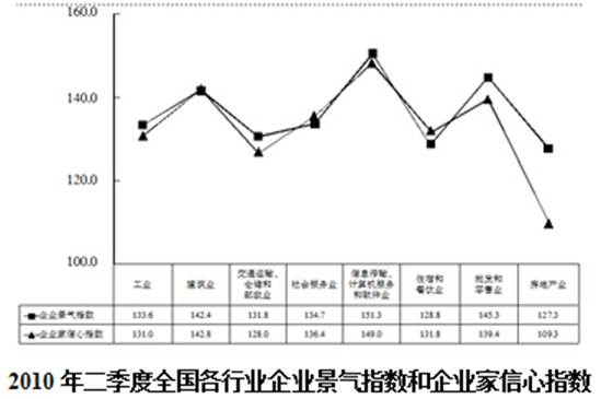 【解析】C。根据两个表格第2行可知,2010年二季度企业景气指数相比一季度有所下降的有批发和零售业、房地产业两个,选C。