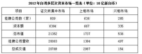 台湾资本市场第一层次是证券交易所集中市场,在准入门槛方面,台湾证交所要求上市企业实收资本6亿新台币以上;在设立年限来看,要求上市企业满3年以上;从获利能力来看,要求上市企业最近1个会计年度无累积亏损,且税前利润占财务报表中的比率最近5个年度达到3%以上,或最近2个年度都达6%。至2012年底,上市公司有809家,资本额6.354兆新台币,台湾证券交易所总市值在世界交易所联合会(wFE)会员中排名与前一年份相同,为第22名,所占比重仍为1.34%;成交值排名第15名,排名不变,所占比重由1.41%略微降至1.39%;周转率排名为第9名,较2011年下降2名。台湾资本市场第二层次是上柜市场.在准人