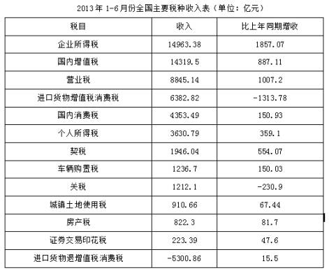 ④2013年我国上半年企业所得税、国内增值税两项之和超过同期税收总收入的50%