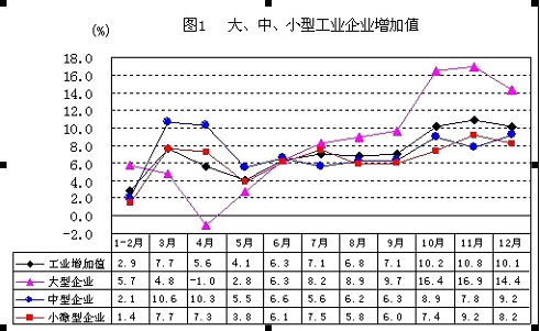 2012某省规模以上工业增加值10875亿元,比上年增长7.1%,年度增速从1-2月的2.9%日升到10-12月的10%以上。大型、中型和小微型企业增加值分别为3074.3217和4584亿元,比上年分别增长8.2%、6.8%和6.7%。