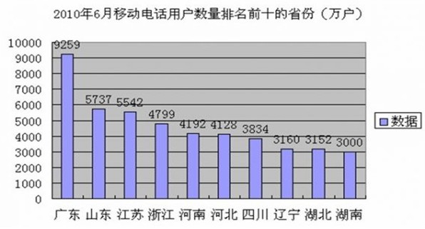 C.2010年6月,广东省移动电话用户数大于辽宁、湖北、湖南三省之和