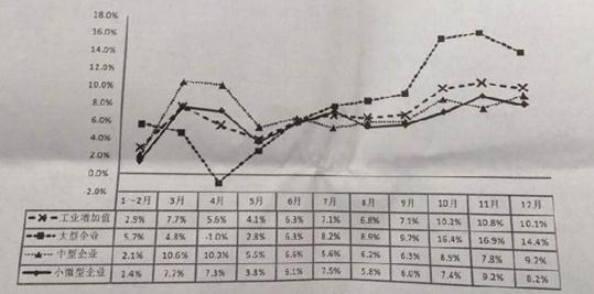 2012年,某省规模以上工业增加值10875亿元,比上年增长7.1%,月度增速从1-2月的2.9%回升到10-12月的10%以上。大型、中型和小微型企业增加值分别为3074、3217和4584亿元,比上年分别增长8.2%、6.8%和6.7%。