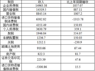2013年二季度,我国税收月收入同比增速逐步提高,分别为7.9%、8.3%、和12.9%.截至2013年6月,全国税收总收入完成59260.61亿元,同比增长7.9%,较上年同期回落1.9个百分点。其中,国内增值税、企业所得税同比分别增长6.6%和14.2%,较上年同期增速分别回落1.5和3.1个百分点;房产税同比分别增长11%,比上年同期增速回落19.1个百分点;进口货物增值税消费税和关税同比分别下降17.1%和16%,比上年同期增速分别回落24.5和22.9个百分点。