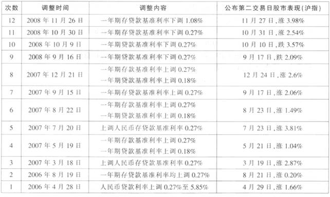 央行历次存货款基准率调整时间、内容及公布第二交易日股市表现