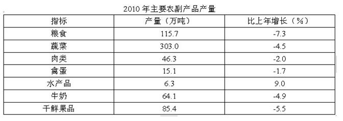 全市农业观光园1303个,比上年增加9个;观光园总收入17.8亿元,比上年增长16.7%。民俗旅游实际经营户7979户,比上年减少726户;民俗旅游总收入7.3亿元,增长20.7%。种业收入14.6亿元,比上年增长13.5%。设施农业占地面积18323公顷,比上年下降2.3%;实现收入40.7亿元,增长20.1%。 2010年主要农副产品产量