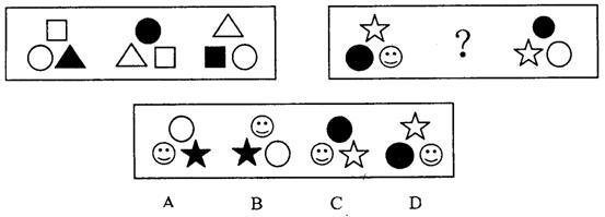 (二)每道题在左边的题干中给出一套图形,其中包括五个图,这五个图形呈现一定的规律性。在右边给出一套图,其中有四个图,让考生从中选出一个作为保持左边五个图规律性的第六个图。
