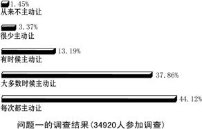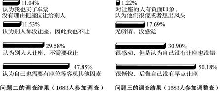 2006年2月21号,上海《东方早报》一篇题为《肺癌老人手持病历 哀求不到公交座位》的报道一石激起千层浪,经网上媒体转载后,跟贴纷纷,评论一片。据了解,上海市的让座率在70%-80%。拿出病历仍然难有人让座,这似乎是个极端案例。有以下三个问题的调查,问题一:乘坐公共汽车的时候,如果身边有年纪很大、身体不好的老人,你是不是每次都主动让座?问题二:如果你不愿给老人让座,是因为什么?问题三:如果你没有让,而其他人主动给身边需要座位的老人让出了座位,你心里怎么想?调查结果如下: