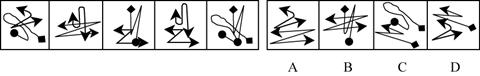 QZZN解析】  这是一道"5+1"题型的图形推理题,规律类别为组合关系。仔细地比较题干中给出的左边5个图形,不难发现,左边5个图形都是封闭图形,依据这一规律,可以推出第6个小图也应为封闭图形,选D