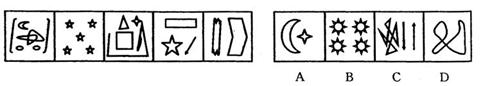 (一)每道题在左边的题干中给出一套图形.其中包括五个图.这五个图形呈现一定的规律性。在右边给出一套图.其中有四个图.从中选出唯一的一项作为保持左边五个图规律性的第六个图。