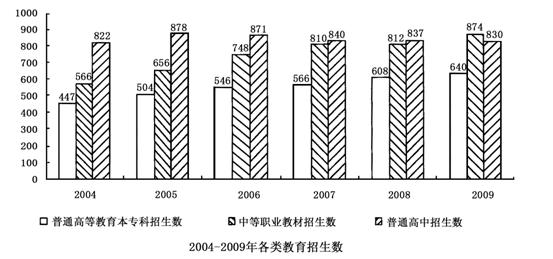 2004-- 2009年全国普通高等教育本专科招生数以及中等职业教育、普通高中招生数见下图: