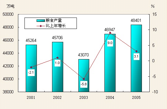 D、“十五”时期粮食产量年增长率最高年份是2004年