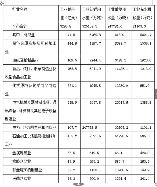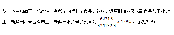 表中工业总生产值排名第2的行业,其工业新鲜用水量占全市工业新鲜用水总量的比重约为: