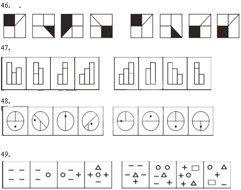 本部分包括四中类型的试题: 图形推理:共8 8题。包括两种类型的题目:每道题目的左右4 4个图形呈现一定的规律性,你需要在右边所给出的备选答案中选出一个最合合理的答案使之符合左边的规律性。每道题只有一个正确答案。