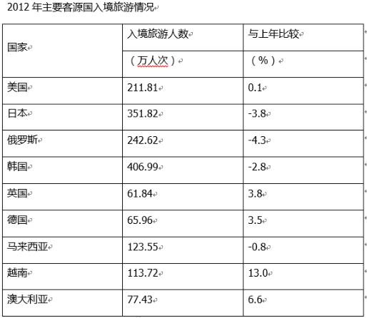 B.2012年,在20个主要客源国中,六成来自亚洲