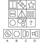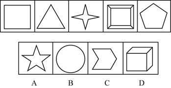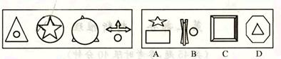 【解析】 上面5个图形和A,C,D这三个图形放在一起,我们发现其中的规律是:有8个大图形和八个小图形,其中,大小不同,形状相同的图形有两个。比如,有一对五角星;一大一小,有一对正方形,一大一小;有一对椭圆,一大一小。