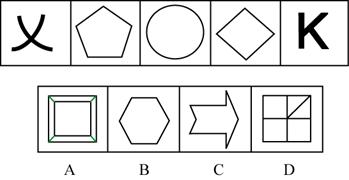 再回头看上面的题目,不难看出所有图形的共同部分是一条水平线。显然,只有D符合。