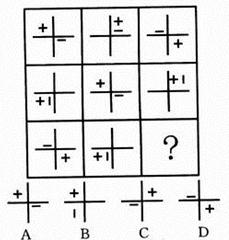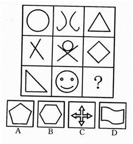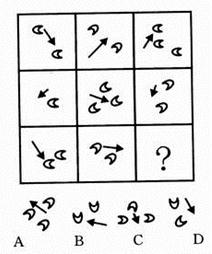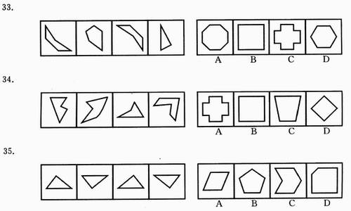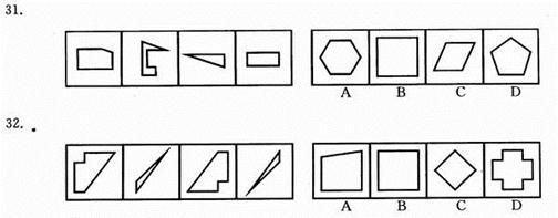 时间:2013-02-19 07:19:24 25.木材︰纸张︰图书 A.高粱︰小麦︰汽车 B.钢铁︰桥梁︰铁路 C.小麦︰面粉︰面包 D.水稻︰大米︰温饱 26.文明︰礼貌︰野蛮 A.诚实︰实际︰虚伪 B.谦逊︰和逊︰卑逊 C.盲目︰盲动︰激动 D.和谐︰协调︰冲突 27.偶数︰奇数︰整数 A.植物︰动物︰生物 B.助教︰讲师︰教授 C.排长︰连长︰营长 D.有理︰无理︰公理 28.性格︰外向︰内向 A.品质︰谦虚︰骄傲 B.股市︰熊市︰牛市 C.心情︰卑微︰诚恳 D.善良︰险恶︰美德 29.青椒︰维生素︰胡萝卜 A.菠菜︰淀粉︰黄瓜 B.鸡蛋︰蛋白质︰大豆 C.面粉︰纤维素︰芹菜 D.西瓜︰脂肪︰牛肉 30.学校︰大学︰北京大学 A.工业︰重工业︰钢铁 B.工艺︰手工艺︰玉器 C.军事︰军队︰海军 D.建筑物︰桥梁︰赵州桥 二、图形推理。包括两种类型的题目。 (一)右边的四个图形中,只有一个是由左边的四个图形拼合而成的,请选出来。 【例题】 【解答】正确答案为A。 请开始答题 (二)请从所给的四个选择项中,选择唯一的一个答案填在问号处,使之呈现一定的规律性。 【例题】 【解答】正确答案为A。 请开始答题: 36. 37. 38. 39. 40. 三、逻辑判断。每题给出一段陈述,这段陈述假设是正确的、不容置疑的。请你根据这段陈述,选择一个答案。注意:正确的答案不需要任何附加说明即可以从陈述中必然推出。 【例题】陈辰是通达公司的经理,赵杰的朋友都在通达公司工作,冯平是赵杰的朋友,公司中某些职工来自广州,通达公司的经济效益不错,公司所有职工都很富有。据此,我们可以知道( ) A.赵杰有一些穷朋友 B.冯平很富有 C.冯平来自广州 D.陈辰与赵杰是朋友 【解答】正确答案是B 请开始答题 41.可能今年有的城市房地产价格会下降。 据此,可以推出( ) A.可能今年有的城市房地产价格不会下降 B.可能今年所有城市的房地产价格都不会下降 C.必然今年有的城市房地产价格会下降 D.不必然今年所有城市房地产价格都不会下降 42.小李和朋友相约:“如果明天阳光灿烂,我就和你一起去踏青。” 据此,可以推出小李爽约的情形是( ) A.明天阳光灿烂,小李的确和朋友一起踏青去了 B.明天阳光灿烂,但小李没有和朋友一起去踏青 C.明天下雨,小李仍和朋友一起踏青去了 D.明天下雨,小李没有和朋友一起去踏青 43.有些想从事行政管理工作的大学生报考了公务员,所有艺术专业的大学生都不想从事行政管理工作。 据此,可以推出( ) A.有些艺术专业的大学生没有报考公务员 B.有些艺术专业的大学生报考了公务员 C.所有艺术专业的大学生都没有报考公务员 D.有些报考了公务员的不是艺术专业的大学生 44.如果张生喜欢摄影,则他会喜欢旅游;如果他不喜欢摄影,则他会喜欢驾车;但是,如果张生不喜欢旅游,则他对驾车也就不感兴趣了。 据此,可以推出张生( ) A.喜欢旅游 B.喜欢驾车 C.不喜欢驾车 D.喜欢摄影 45.某省举行“文明城市”评比。4位评委对大家普遍看好的A、B、C等3城市获得“文明城市”称号的可能性进行了分析预测。 评委甲说:“要么A市能获得,要么C市能获得。” 评委乙说:“如果A市与C市能获得,则B市也能获得。” 评委丙说:“只有当B市不能获得或者C市能获得时,A市才不能获得。” 评委丁说:“我看B市能获得的可能性为零,而A市与C市一定能获得。” 评比结束后发现,4位评委中只有一人预测成立。 据此,可以推出获得“文明城市”称号的城市是( ) A.A市 B.B市 C.C市 D.A、B、C等3市 46.某体育代表队在一次比赛中共获A、B、C、D等4个项目的奖牌若干枚。其中,A项目奖牌数大于C、D两项目奖牌数之和,C项目奖牌数大于D项目奖牌数,并且,在D项目上至少获得两枚奖牌,在B项目上至少获得一枚奖牌。 据此,可以推出该队在此次比赛中共获奖牌数至少是( ) A.10 B.11 C.12 D.13 47.如果选购了股票,则不能投资期货;只有投资期货,才能投资邮票;或者投资邮票,或者投资外汇;但是最近投资外汇风险太大,不能操作。 据此,可以推出( ) A.选购股票 B.不选购股票 C.不投资邮票 &nbs