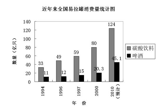 96.根据上图,预计到2010年,全国易拉罐消费将达到多少亿只?