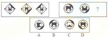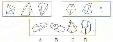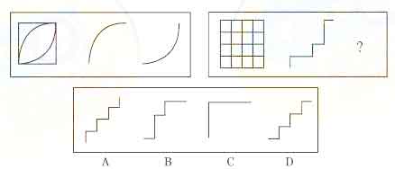 三、图形推理:共10题。每道题包含两套图形和可供选择的4个图形。这两套图形具有某种相似性,也存在某种差异。要求你从四个选项中选择你认为最适合取代问号的一个。正确的答案应不仅使两套图形表现出最大的相似性,而且使第二套图形也表现出自己的特征。