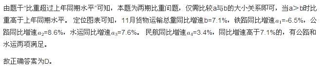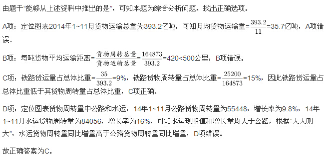 由题干“2013年1~10月我国货运运输总量最大的领域”可知,本题是基期比较问题,比较各领域1~10月基期货物运输总量即可。观察图表可知,各领域1~11月和11月同比增速相差不大,故本题可直接比较1~10月现期值。铁路=35-3.2=31.8亿吨,公路=303.6-30.7=272.9亿吨,水运=54.5-5.4=49.1亿吨,民航=538-55.5=482.5万吨,可明显看出公路272.9亿吨最大。(注意单位,1亿吨=10000万吨)