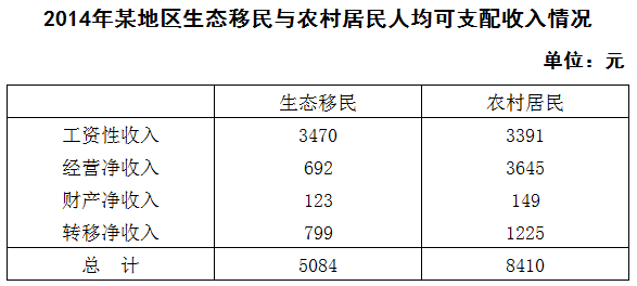 2014年,某地区生态移民人均可支配收入5084元,其中县内移民人均可支配收入4933元,县外移民人均可支配收入5233元,2014年该地区生态移民人均可支配收入比农村居民人均可支配收入低3326元,比该地区山区九县农村居民人均可支配收入低1099元。