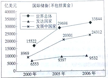2000年、2005年、2006年发达国家、发展中国家和世界总体的国际储备(不包括黄金)和黄金储备变化情况,如图所示: