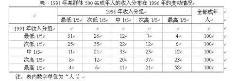 有学者跟踪研究了某群体500名成年人的收入情况,并将1991年该人群的收入分布在1996年的变动情况绘制成表2。如1991年属于收入最低1/5组的该人群在1996年时有51人依然处于同一位置,而有4人进入了收入最高1/5组。