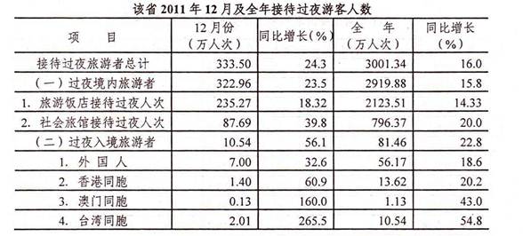 2011年某省接待过夜游客总量再次实现突破,达到3001.34万人次,同比增长