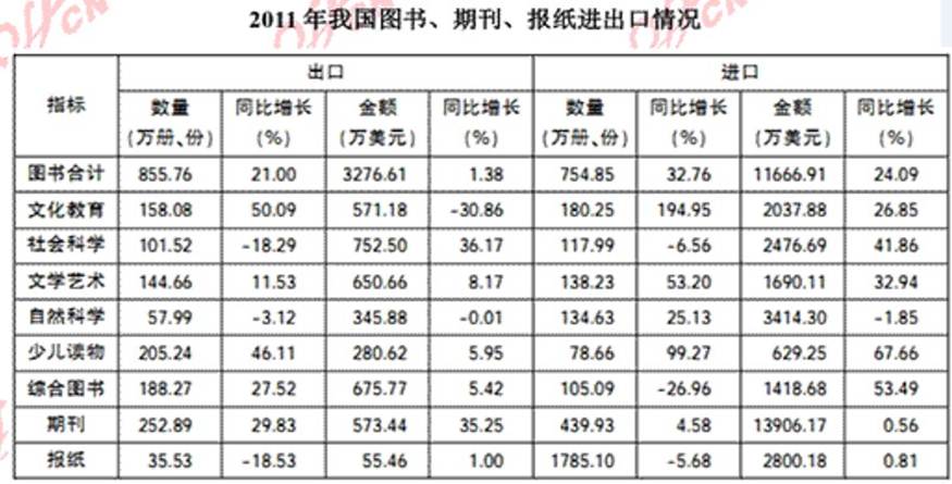 B.2011年,与期刊、报纸相比,图书的出口额和进口总额都是最高的