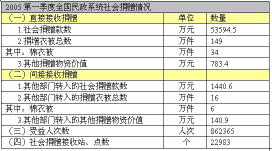 1. 005年第一季度全国民政系统间接接收的社会捐款总数同比增长迅速