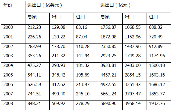 B. 2001~2008年,该省每年出口总额相对上年增幅最小的年份是2001年