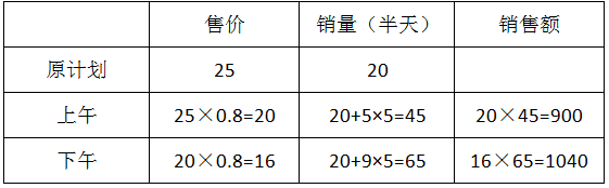 由题意可得,商品每降价1元销量增加5个。上午商品打八折出售,下午商品在上午价格的基础上再打八折,列表可得: