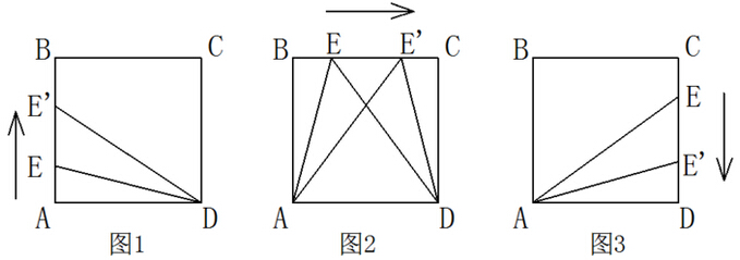 小蚂蚁从A点到B点的过程中,三角形AED的底为AD,长度不变,高AE随着小蚂蚁向上爬而增长,故三角形AED的面积随时间增长(如图1所示);小蚂蚁从B点到C点的过程中,三角形AED的底为AD,长度不变,高为正方形的边长10cm,也不变,故三角形AED的面积不随时间变化一直相等(如图2所示);小蚂蚁从C点到D点的过程中,三角形AED的底为AD,长度不变,高DE随着小蚂蚁向下爬而减少,故三角形AED的面积随时间减少(如图3所示)。只有A项符合三角形AED面积随时间先增长,再不变最后减小的趋势。