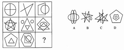 (一)每道题在左边的题干中给出一套图,其中包括五个图,这五个图形呈现一定的规律性。在右边给出一套图,其中有四个图,从中选出唯一的一项作为保持左边五个图形规律性的第六个图。