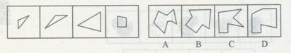 (二)右边四个图形中,只有一个是由左边的四个图形拼合(只能通过上、下、左、右平移)而成的,请把它找出来。