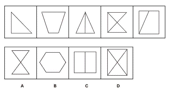 89.在题干中给出一套图形,其中有五个图,这五个图呈现一定的规律性。在给出的另一套图形中,有四个图,从中选出唯一的一项作为保持左边五个图规律性的第六个图。