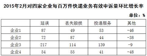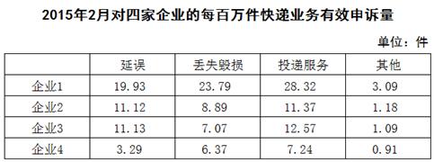 2015年2月,全国每百万件快递业务中,有效申诉量未23.4件,对企业1的每百万件有效申诉量为75.13件,环比增长48.0%,对企业2的每百万件有效申诉量未32.56件,环比增长55.0%,对企业3的每百万件有效申诉量为31.86件,环比增长140.0%,对企业4的每百万件有效申诉量为17.81件,环比增长36.0%。