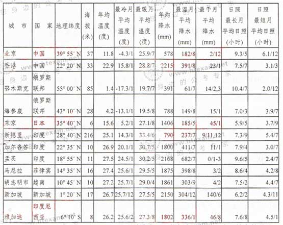 世界部分城市气候状况