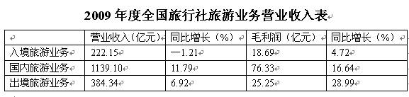 2009年度全国旅行社的旅游业务营业收入为1745.59亿元,同比增长8.87%;旅游业务毛利润为120.27亿元,旅游业务毛利率为6.89%;实缴税金为12.69亿元,同比增长12.37%;外汇结汇10.51亿美元,同比减少11.24%;全国促销费支出为6.76亿元,同比增长13.87%。