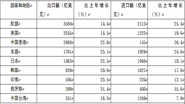 2011年我国全年货物进出口总额36421亿美元,比上年增长22.5%。其中,出口18986亿美元,增长20.3%;进口中17435亿美元,增长24.9%。进出口差额(出口值与进口值差额的绝对值)1551亿美元,比上年减少265亿美元。