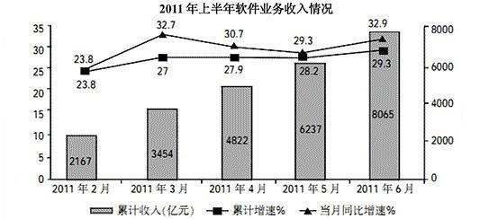 2011年上年年,我国软件产业实现软件业务收入8065亿元,同比增长29.3%,增速比去年同期高0.2个百分点;实现利润103亿元,同比增长3.49%。其中,6月份完成软件业务收入1828亿元,同比增长32.9,增速比5月份回升3.6个百分点。