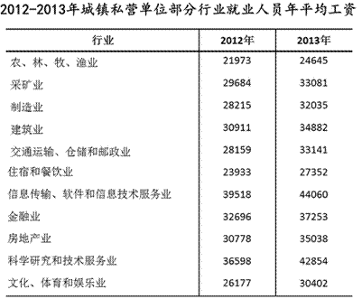 B.表中只有3个行业2013年的人均工资不再3-4万元范围