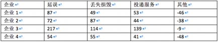 2015年2月,全国每百万件快递业务中,有效申诉量为23.4件。对企业1的每百万件有效申诉量为75.13件,环比增长48.0%,对企业2的每百万件有效申诉量为32.56件,环比增长55.0%,对企业3的每百万件有效申诉量为31.86件,环比增长140.0%,对企业4的每百万件有效申诉量为17.81件,环比增长36.0%。