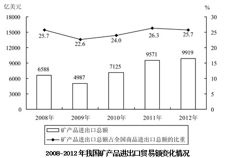 2014-四川--AA.2012年,我国矿产品对外贸易活跃,进出口额9919亿美元,同比增长3.6%,其中,进口额同比增长1.4%,出口额同比增长7.6%。