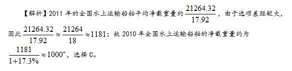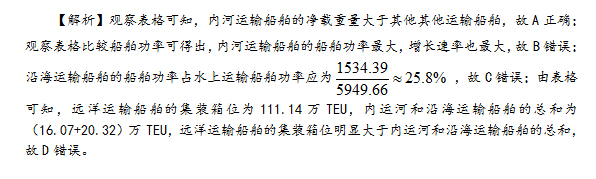 107.【解析】C。观察表格中的数据可直接读出,在内河运输船舶、沿海运输船舶及远洋运输船舶中,内河运输船舶的平均净载客量均低于其他形式的运输船舶。 [行测真题]