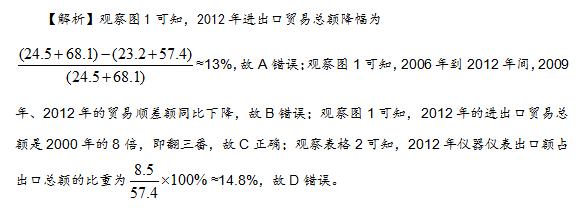 112.【解析】C。由柱状图可知,同比增长量最高的年份为2007年,当年的贸易顺差为50.1-12.1=38亿美元。